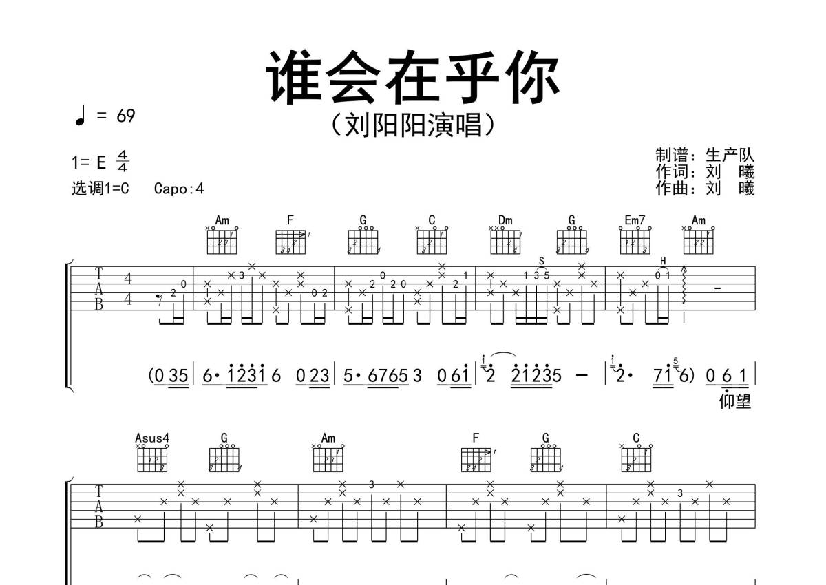 《谁会在乎你》是刘阳阳演唱的一首歌曲,精编完美版,拍号为4/4拍,歌曲速度为每分钟69拍,歌曲原调为E调,但由于原调指法比较难,为了方便弹奏,本吉他谱采用的是C调指法编配,变调夹4品弹奏即为原调,当然也可以根据自己的音域改变变调夹位置,或者通过改变和弦调性,以方便自己弹奏,这份吉他谱共有三张高清图谱,图谱由 @生产队 编配上传,图谱使用六线谱编配,包含吉他和弦指法、简谱以及歌词部分,使用这份谁会在乎你吉他谱,可以让你更加方便地掌握这首歌曲的弹唱技巧,快来尝试吧。《谁会在乎你》是歌手刘阳阳演唱的最新单曲。本吉他谱根据原版C调指法编配,完整的前奏、间奏、尾奏和solo编配,精编完美版,值得推荐的一首民谣歌曲。仰望星空寻找着方向,那颗心依然在飘荡,在这不冷不热岁月中,谁会为你点亮那灯光。