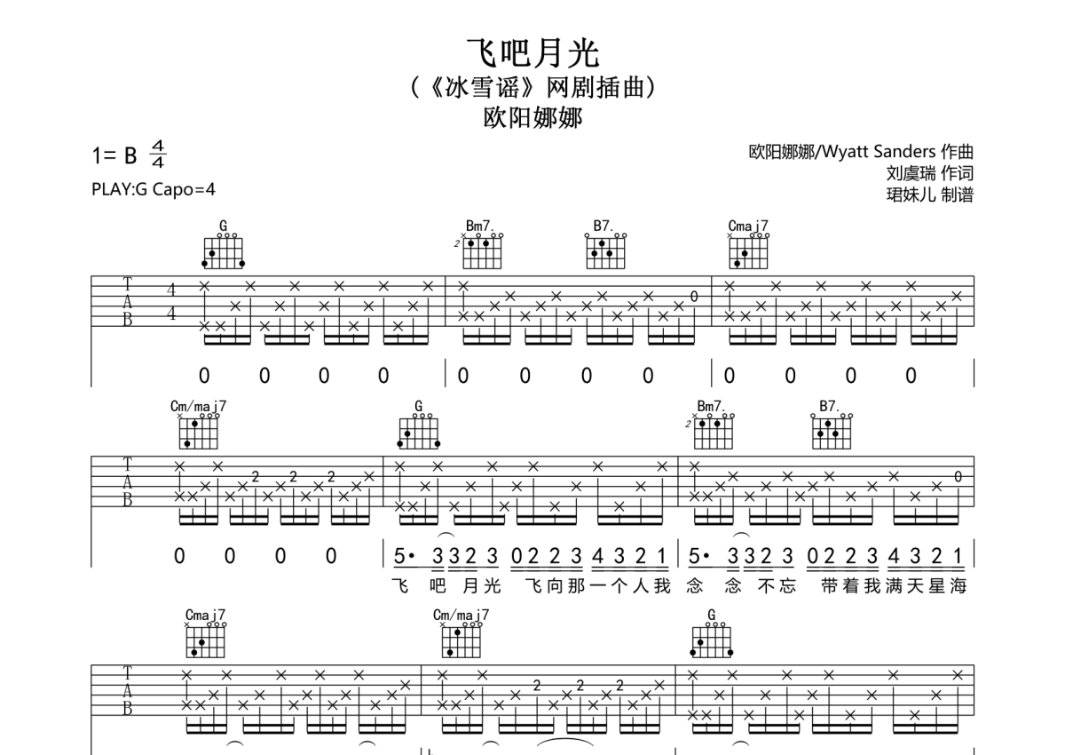 《飞吧月光》是欧阳娜娜演唱的一首歌曲,拍号为4/4拍,歌曲速度为每分钟85拍,歌曲原调为B调,但由于原调指法比较难,为了方便弹奏,本吉他谱采用的是G调指法编配,变调夹4品弹奏即为原调,当然也可以根据自己的音域改变变调夹位置,或者通过改变和弦调性,以方便自己弹奏,这份吉他谱共有三张高清图谱,图谱由 @珺妹儿 编配上传,图谱使用六线谱编配,包含吉他和弦指法、简谱以及歌词部分,使用这份飞吧月光吉他谱,可以让你更加方便地掌握这首歌曲的弹唱技巧,快来尝试吧。