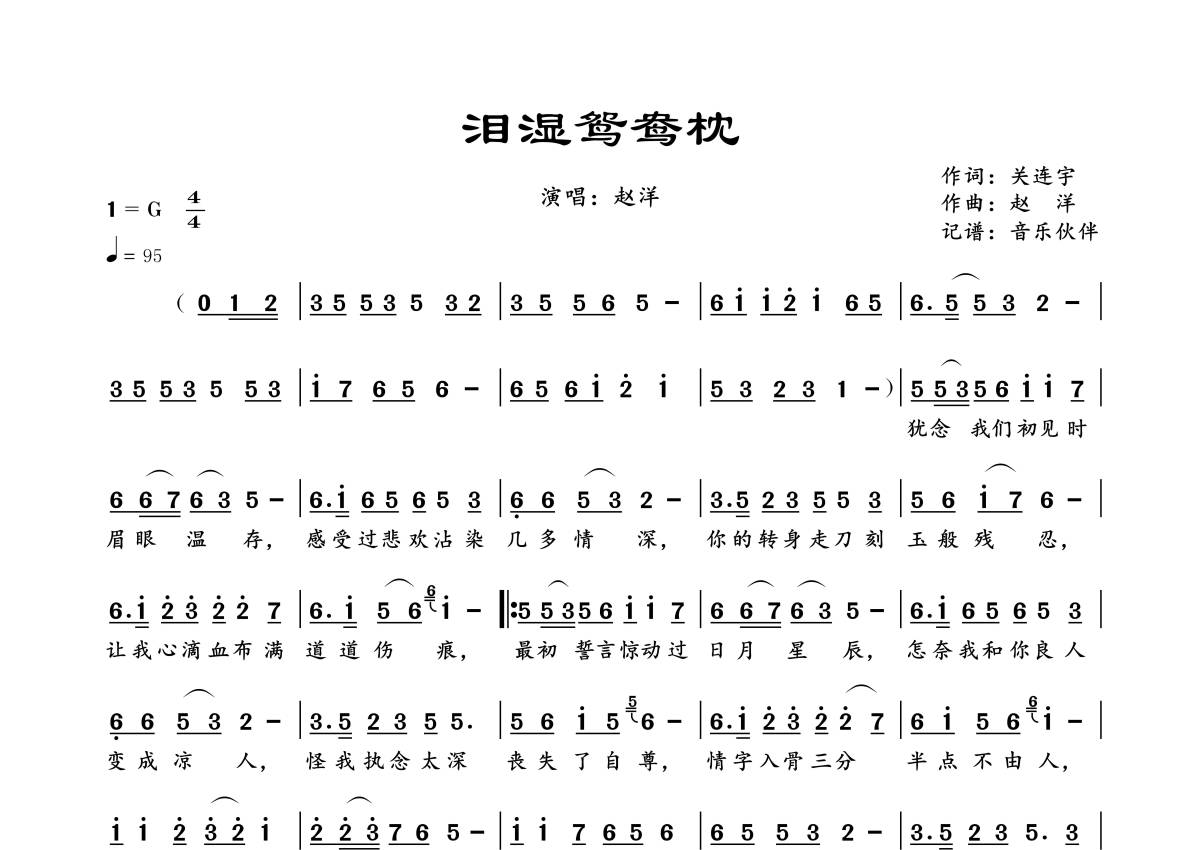 《泪湿鸳鸯枕》是赵洋演唱的一首歌曲,拍号为4/4拍,歌曲速度为每分钟95拍,这份简谱共有一张高清图谱,图谱由 @音乐伙伴 编配上传。