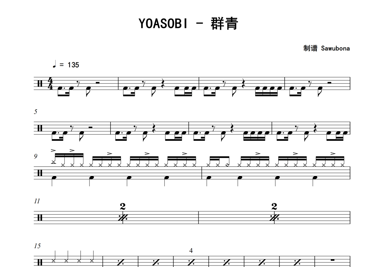 《群青》是YOASOBI演唱的一首歌曲,拍号为4/4拍,歌曲速度为每分钟135拍,这份架子鼓谱共有四张高清图谱,图谱由 @Sawubona 编配上传,图谱使用五线谱编配,使用这份群青架子鼓谱,你将能够轻松地敲打出这首YOASOBI的群青,快来尝试吧。