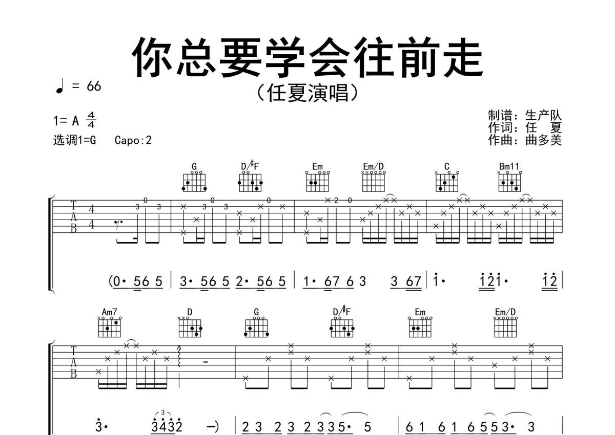 《你总要学会往前走》是任夏演唱的一首歌曲,精编完美版,拍号为4/4拍,歌曲速度为每分钟66拍,歌曲原调为A调,但由于原调指法比较难,为了方便弹奏,本吉他谱采用的是G调指法编配,变调夹2品弹奏即为原调,当然也可以根据自己的音域改变变调夹位置,或者通过改变和弦调性,以方便自己弹奏,这份吉他谱共有两张高清图谱,图谱由 @生产队 编配上传,图谱使用六线谱编配,包含吉他和弦指法、简谱以及歌词部分,使用这份你总要学会往前走吉他谱,可以让你更加方便地掌握这首歌曲的弹唱技巧,快来尝试吧。《你总要学会往前走》是任夏演唱的歌曲。本吉他谱根据原版G调指法编配,完整的前奏、间奏、尾奏编配,值得推荐的一首民谣歌曲。你往前走,不要回头,别再为旧人旧事湿了眼眸,别怕失去,学会放手,世上还有另一种幸福叫曾经拥有。