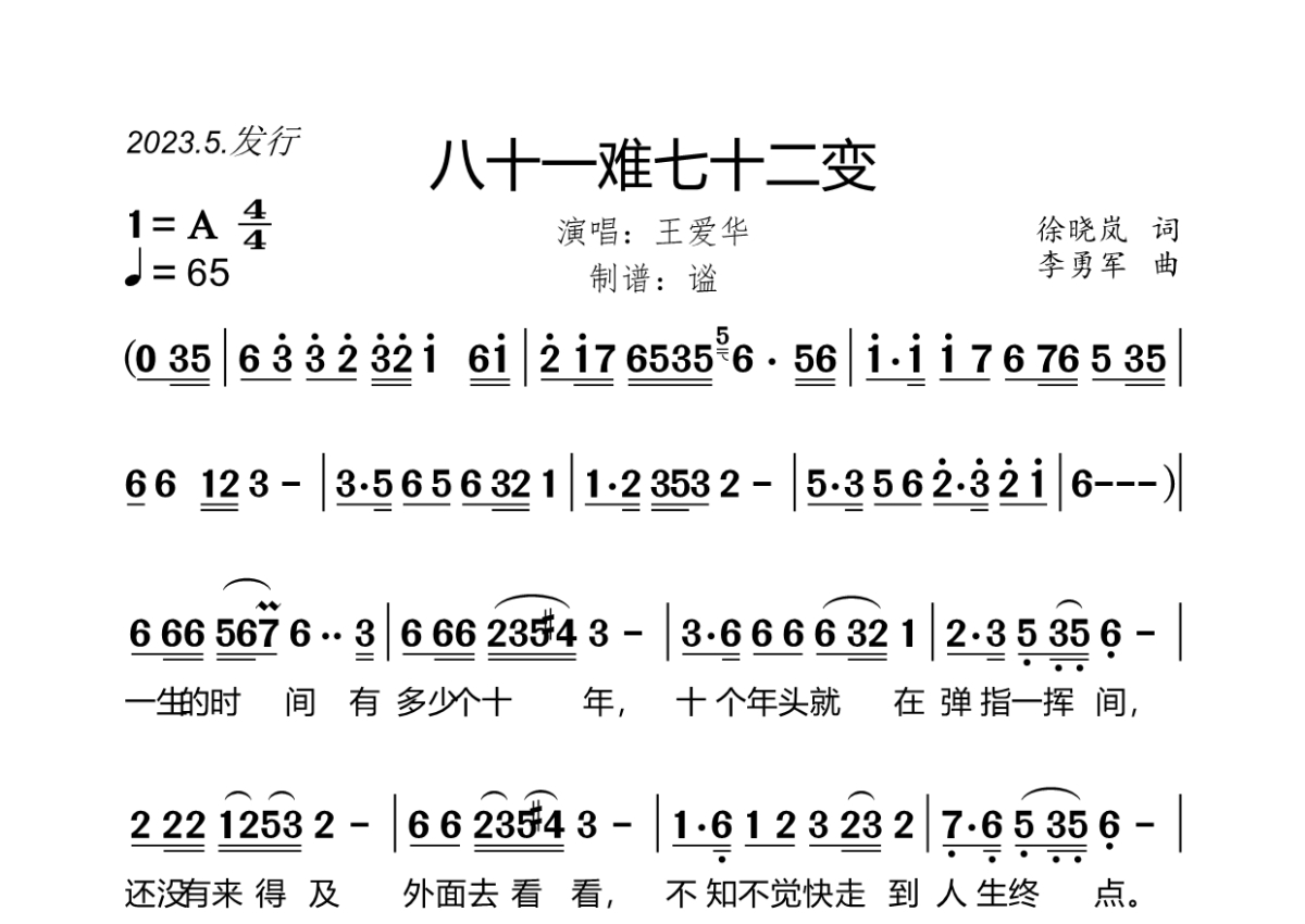 《八十一难七十二变》是王爱华演唱的一首歌曲,拍号为4/4拍,歌曲速度为每分钟65拍,这份简谱共有两张高清图谱,图谱由 @谧 编配上传王爱华演唱的《八十一难七十二变》,原版完整简谱,A调,4/4拍,速度65,谧精心制谱,共2页。