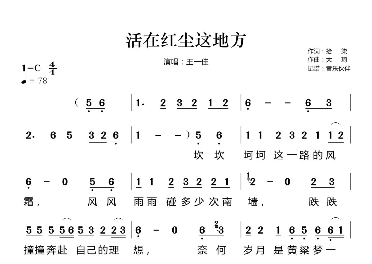 活在红尘这地方简谱 - 王一佳演唱