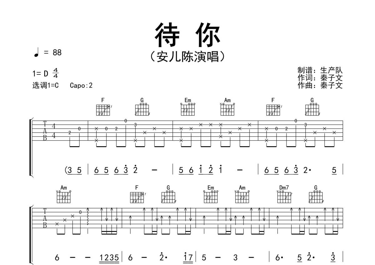 《待你》是安儿陈演唱的一首歌曲,精编完美版,拍号为4/4拍,歌曲速度为每分钟88拍,歌曲原调为D调,但由于原调指法比较难,为了方便弹奏,本吉他谱采用的是C调指法编配,变调夹2品弹奏即为原调,当然也可以根据自己的音域改变变调夹位置,或者通过改变和弦调性,以方便自己弹奏,这份吉他谱共有三张高清图谱,图谱由 @生产队 编配上传,图谱使用六线谱编配,包含吉他和弦指法、简谱以及歌词部分,使用这份待你吉他谱,可以让你更加方便地掌握这首歌曲的弹唱技巧,快来尝试吧。《待你》是歌手安儿陈演唱的歌曲。本吉他谱根据原版C调指法编配,完整的前奏、间奏、尾奏和solo编配,精编完美版,值得推荐的一首民谣歌曲。待你了无牵挂,许我浪迹天涯,待你功成名达,许我花前月下,待你不再有她,许我淡饭粗茶,待你富贵荣华,许我十里桃花。
