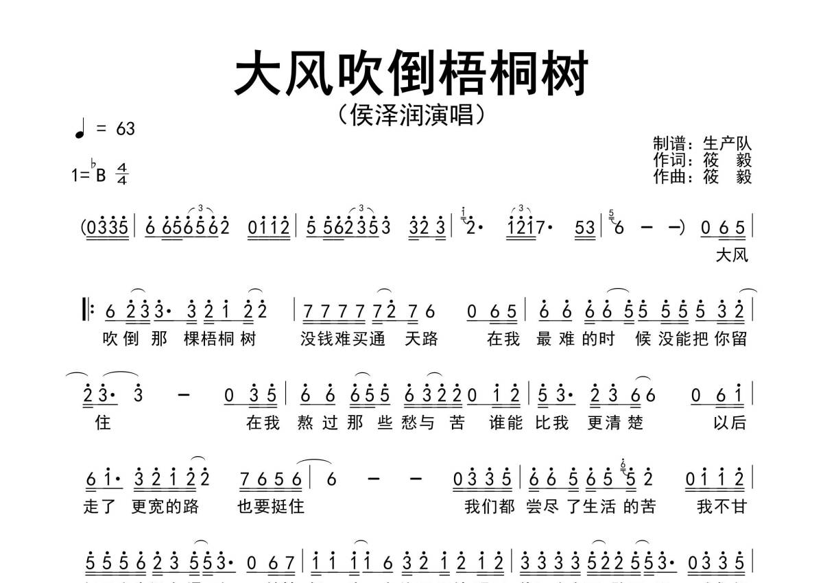《大风吹倒梧桐树》是侯泽润演唱的一首歌曲,原版简谱,拍号为4/4拍,歌曲速度为每分钟63拍,这份简谱共有一张高清图谱,图谱由 @生产队 编配上传侯泽润演唱的歌曲《大风吹倒梧桐树》原版简谱。完整的前奏、间奏、尾奏solo编配。