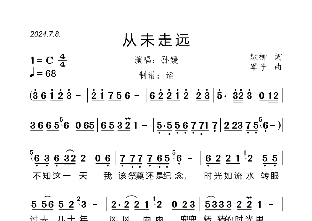 《从未走远》是孙媛演唱的一首歌曲,拍号为4/4拍,歌曲速度为每分钟67拍,这份简谱共有两张高清图谱,图谱由 @谧 编配上传孙媛演唱的《从未走远》,绿柳作词,军子作曲,C调,4/4拍,速度68,原版完整简谱,大字版,共2页,谧精心制谱。