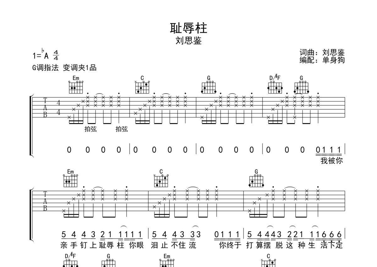 耻辱柱吉他谱 - 刘思鉴 - G调弹唱六线谱