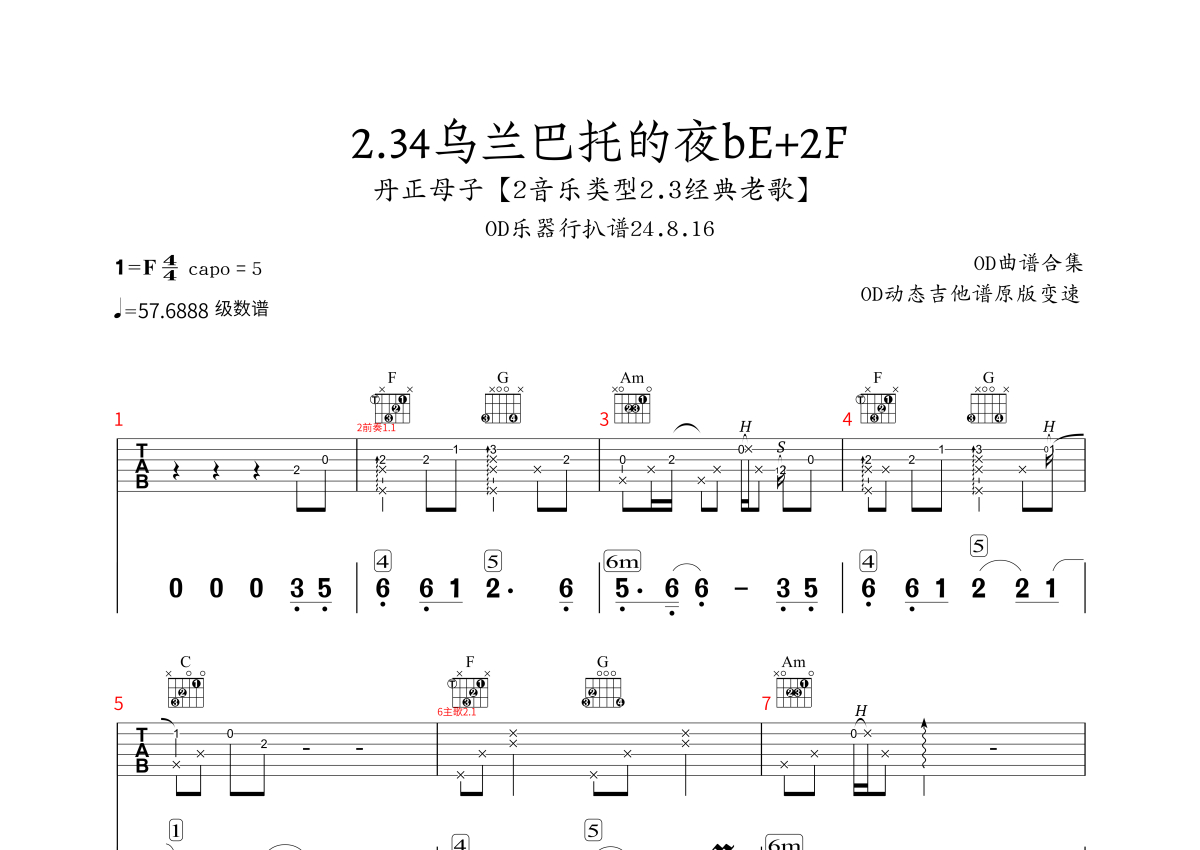 《乌兰巴托的夜》是丹正母子演唱的一首歌曲,拍号为4/4拍,歌曲速度为每分钟58拍,歌曲原调为F调,但由于原调指法比较难,为了方便弹奏,本吉他谱采用的是C调指法编配,变调夹5品弹奏即为原调,当然也可以根据自己的音域改变变调夹位置,或者通过改变和弦调性,以方便自己弹奏,这份吉他谱共有四张高清图谱,图谱由 @OD乐器行₁₅₂⁰⁵⁹¹₀₅₉₅ 编配上传,图谱使用六线谱编配,包含吉他和弦指法、简谱以及歌词部分,曲谱配备了相关的音频提供试听,使用这份乌兰巴托的夜吉他谱,可以让你更加方便地掌握这首歌曲的弹唱技巧,快来尝试吧。
