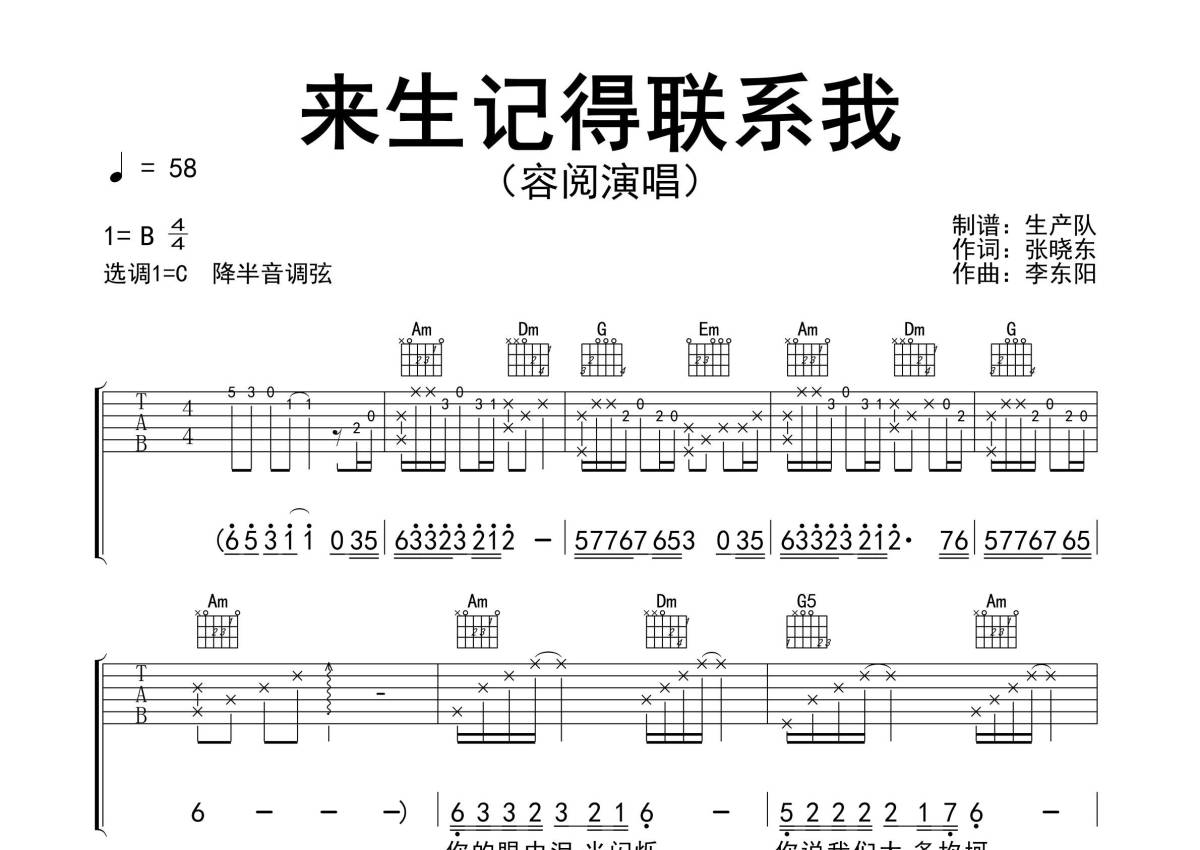 《来生记得联系我》是容阅演唱的一首歌曲,精编完美版,拍号为4/4拍,歌曲速度为每分钟58拍,歌曲原调为B调,但由于原调指法比较难,为了方便弹奏,本吉他谱采用的是C调指法编配,降半音调弦弹奏即为原调,当然也可以根据自己的音域决定是否调弦,这份吉他谱共有两张高清图谱,图谱由 @生产队 编配上传,图谱使用六线谱编配,包含吉他和弦指法、简谱以及歌词部分,使用这份来生记得联系我吉他谱,可以让你更加方便地掌握这首歌曲的弹唱技巧,快来尝试吧。《来生记得联系我》是由歌手容阅演唱的歌曲。本吉他谱根据原版C调指法编配,完整的前奏、间奏、尾奏和solo编配,精编完美版,值得推荐的一首抒情歌曲。来生记得联系我,我会等你在天涯漂泊,等你从身旁走过,陪我一起看黄昏日落。