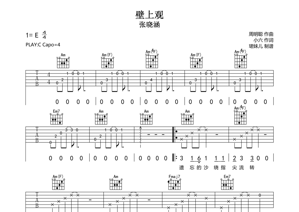张晓涵《壁上观》吉他谱 - C调弹唱六线谱
