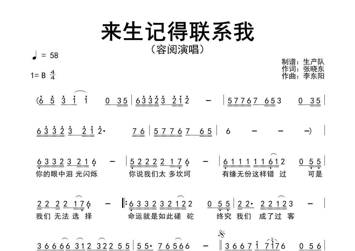 《来生记得联系我》是容阅演唱的一首歌曲,原版简谱,拍号为4/4拍,歌曲速度为每分钟58拍,这份简谱共有一张高清图谱,图谱由 @生产队 编配上传容阅演唱的歌曲《来生记得联系我》原版简谱,完整的前奏,间奏,尾奏solo编配。