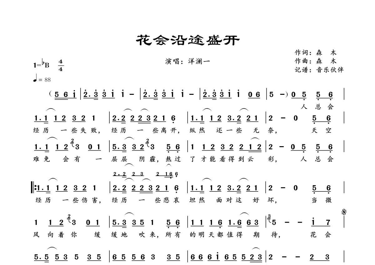 《花会沿途盛开》是洋澜一演唱的一首歌曲,拍号为4/4拍,歌曲速度为每分钟88拍,这份简谱共有一张高清图谱,图谱由 @音乐伙伴 编配上传。