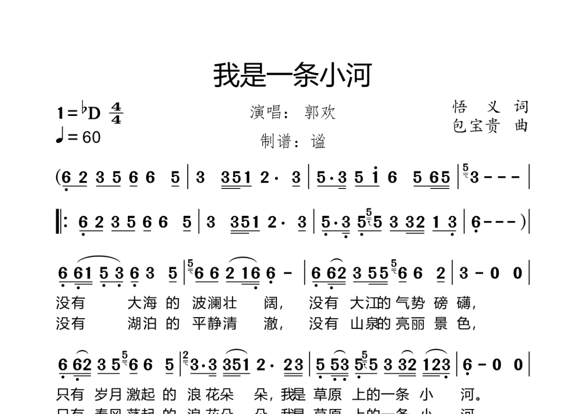 《我是一条小河》是郭欢演唱的一首歌曲,拍号为4/4拍,歌曲速度为每分钟60拍,这份简谱共有一张高清图谱,图谱由 @谧 编配上传郭欢演唱的《我是一条小河》,bD调,4/4拍,速度60,原版完整简谱,谧精心制谱。