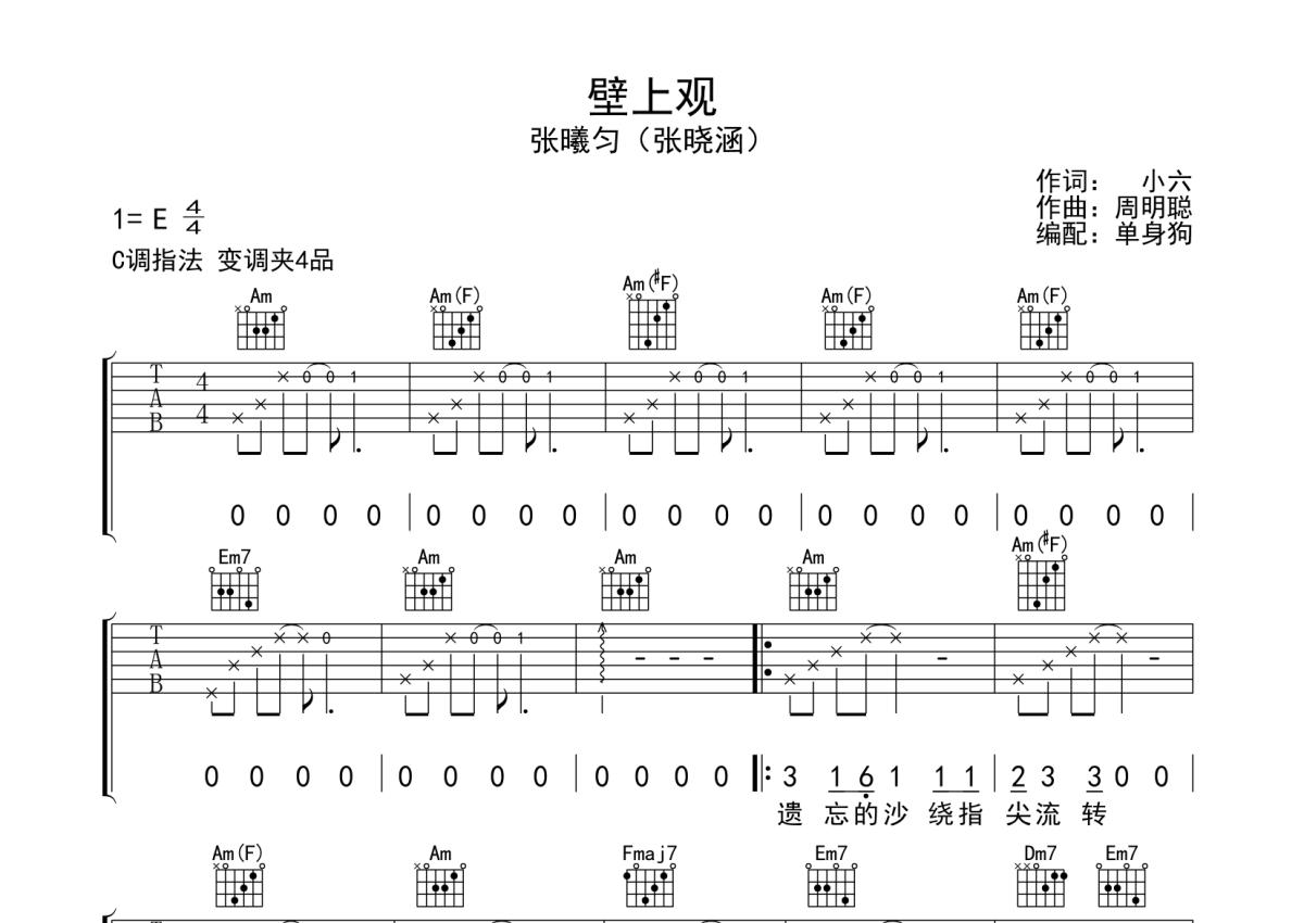 壁上观吉他谱 - 张晓涵 - C调弹唱六线谱