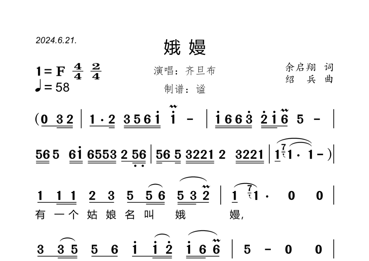《娥嫚》是齐旦布演唱的一首歌曲,拍号为4/4拍,歌曲速度为每分钟56拍,这份简谱共有三张高清图谱,图谱由 @谧 编配上传齐旦布演唱的《娥嫚》,E调,4/4拍,速度58,原版完整简谱,大字版,谧精心制谱,共3页。