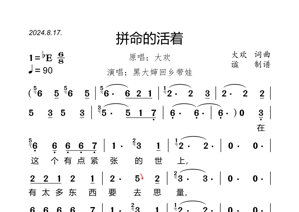 《拼命的活着》是黑大婶回乡带娃演唱的一首歌曲,拍号为6/8拍,歌曲速度为每分钟90拍,这份简谱共有两张高清图谱,图谱由 @谧 编配上传黑大婶回乡带娃演唱的《拼命的活着》,bE调,6/8拍,速度90,原版完整简谱,谧精心制谱,共2页。