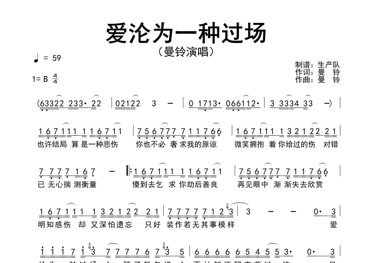 《爱沦为一种过场》是曼铃演唱的一首歌曲,原版简谱,拍号为4/4拍,歌曲速度为每分钟59拍,这份简谱共有一张高清图谱,图谱由 @生产队 编配上传曼铃演唱的歌曲《爱沦为一种过场》原版简谱,完整的前奏、间奏solo编配。