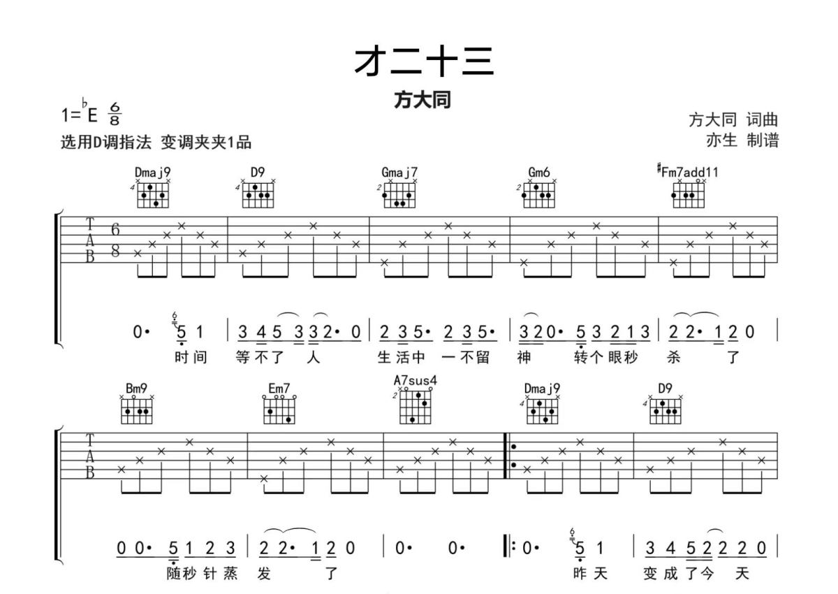 《才二十三》是方大同演唱的一首歌曲,拍号为4/4拍,歌曲原调为Eb调,但由于原调指法比较难,为了方便弹奏,本吉他谱采用的是D调指法编配,变调夹1品弹奏即为原调,当然也可以根据自己的音域改变变调夹位置,或者通过改变和弦调性,以方便自己弹奏,这份吉他谱共有三张高清图谱,图谱由 @亦生 编配上传,图谱使用六线谱编配,包含吉他和弦指法、简谱以及歌词部分,使用这份才二十三吉他谱,可以让你更加方便地掌握这首歌曲的弹唱技巧,快来尝试吧。