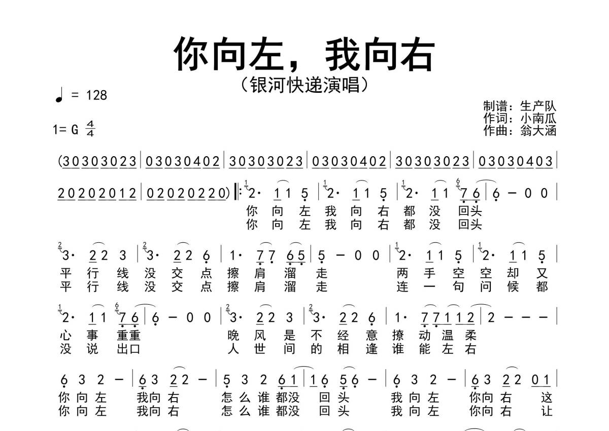 《你向左,我向右》是银河快递演唱的一首歌曲,原版简谱,拍号为4/4拍,歌曲速度为每分钟128拍,这份简谱共有一张高清图谱,图谱由 @生产队 编配上传银河快递演唱的歌曲《你向左,我向右》原版简谱,完整的前奏、间奏solo编配。