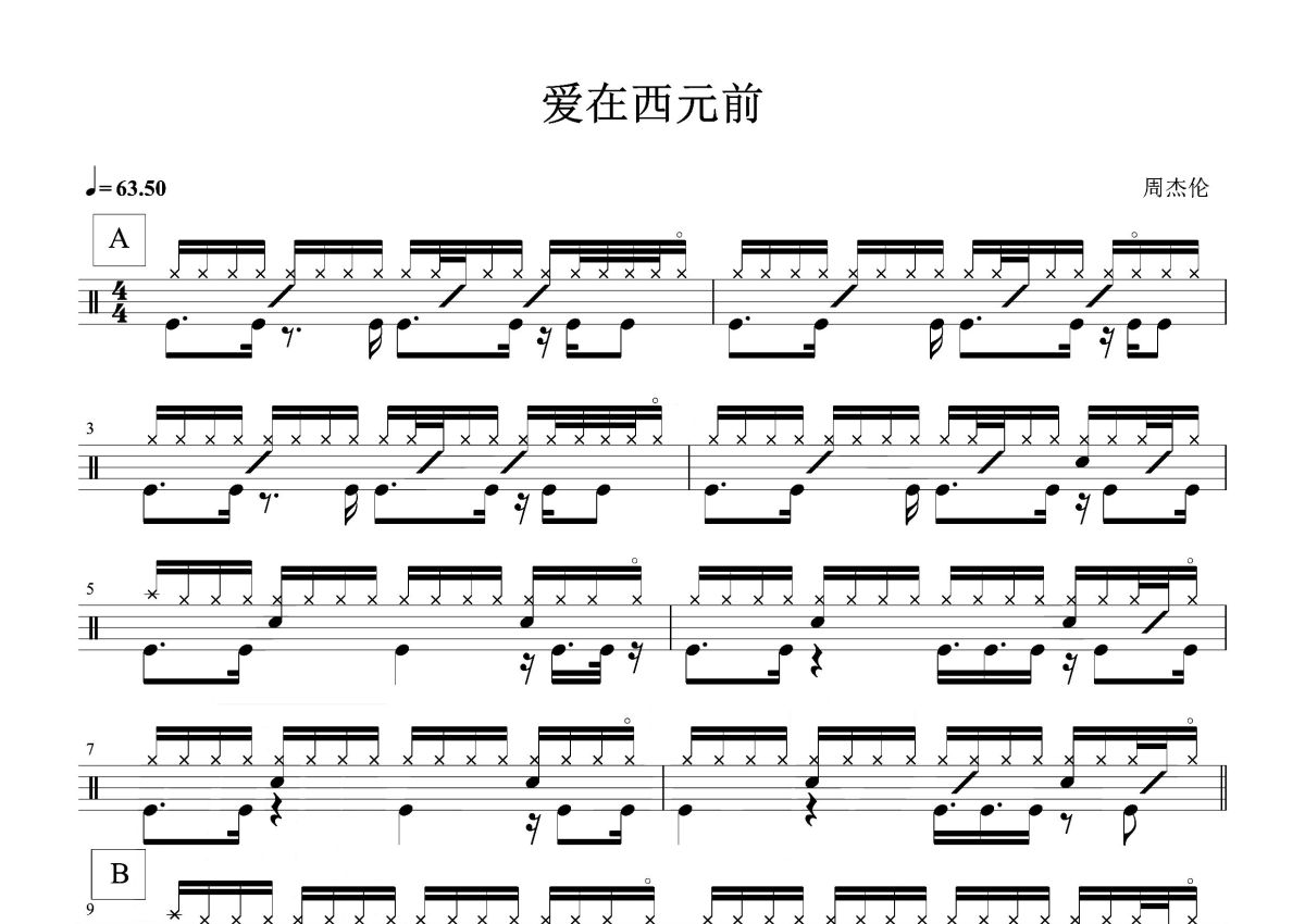 《爱在西元前》是周杰伦演唱的一首歌曲,这份鼓谱共有四张高清图谱,图谱由 @打鼓谱 编配上传,图谱使用五线谱编配,使用这份爱在西元前架子鼓谱,你将能够轻松地敲打出这首周杰伦的爱在西元前,快来尝试吧。《爱在西元前》是周杰伦演唱的一首歌曲,由方文山作词,周杰伦作曲,林迈可编曲,收录在周杰伦2001年9月20日发行的专辑《范特西》中。周杰伦(Jay Chou),1979年1月18日出生于台湾省新北市,祖籍福建省泉州市永春县,中国台湾流行乐男歌手、原创音乐人、演员、导演、编剧,毕业于淡江中学。