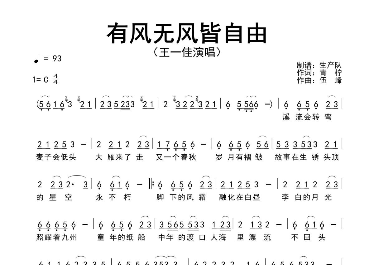 《有风无风皆自由》是王一佳演唱的一首歌曲,原版简谱,拍号为4/4拍,歌曲速度为每分钟93拍,这份简谱共有一张高清图谱,图谱由 @生产队 编配上传王一佳演唱的歌曲《有风无风皆自由》原版简谱,精准的前奏、间奏、尾奏solo编配。