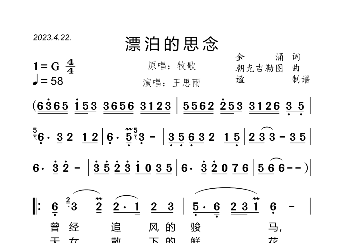《漂泊的思念》是王思雨演唱的一首歌曲,拍号为4/4拍,歌曲速度为每分钟58拍,这份简谱共有三张高清图谱,图谱由 @谧 编配上传王思雨演唱的《漂泊的思念》,G调,4/4拍,速度58,原版完整简谱,大字版,谧精心制谱,共3页。