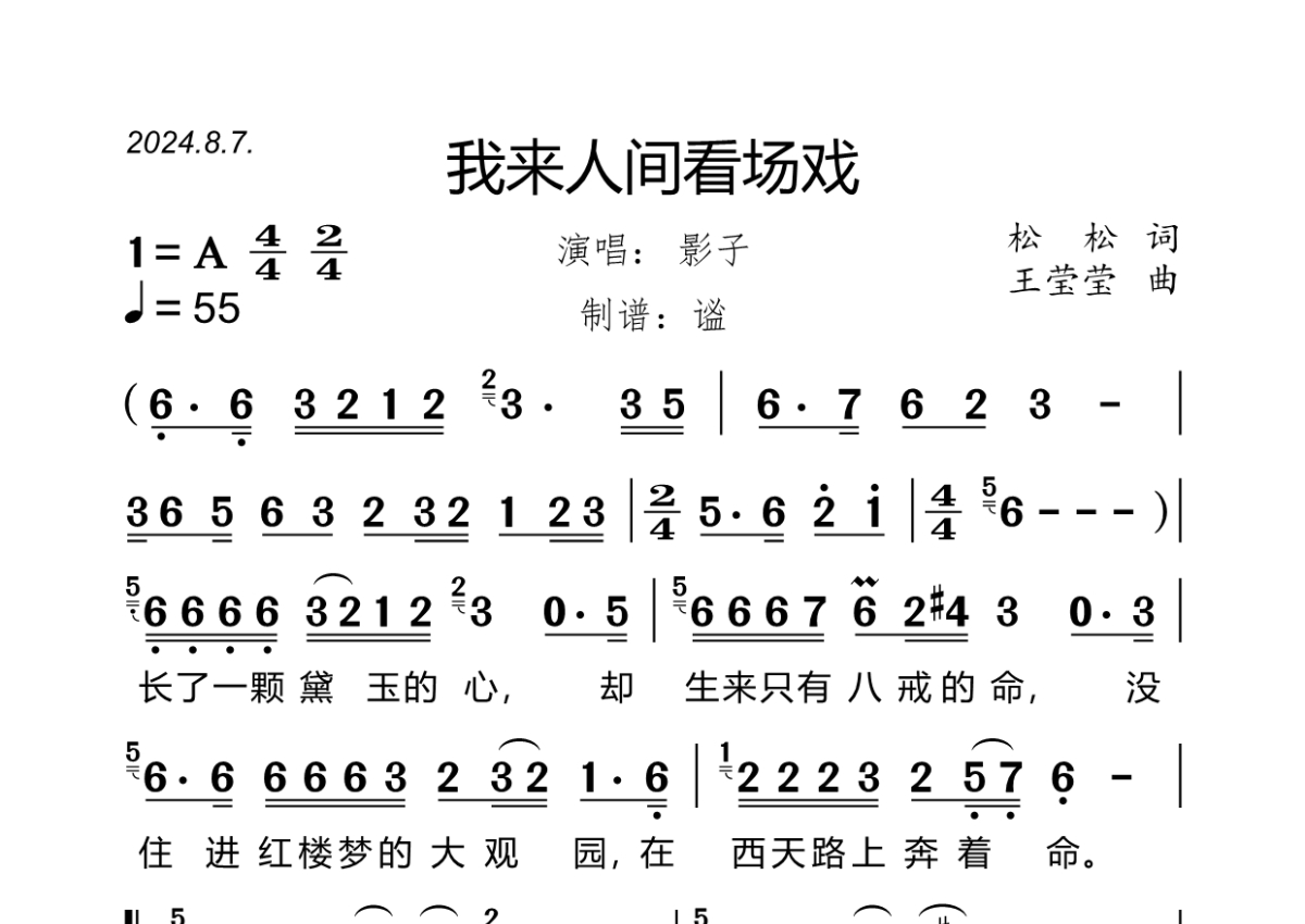《我来人间看场戏》是影子演唱的一首歌曲,拍号为4/4拍,歌曲速度为每分钟55拍,这份简谱共有两张高清图谱,图谱由 @谧 编配上传影子演唱的《我来人间看场戏》,原版完整简谱,A调,4/4、2/4拍,速度55,大字版,谧精心制谱,共2页。