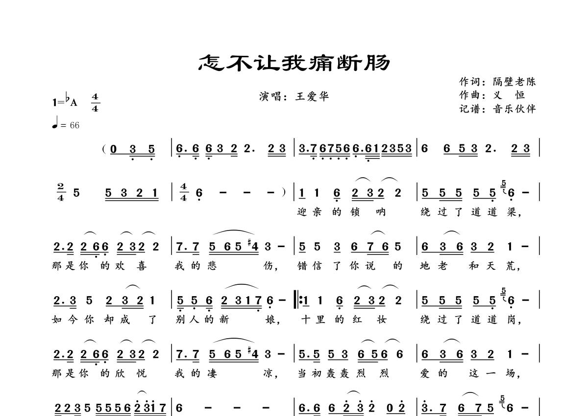 《怎不让我痛断肠》是王爱华演唱的一首歌曲,拍号为4/4拍,歌曲速度为每分钟66拍,这份简谱共有一张高清图谱,图谱由 @音乐伙伴 编配上传。