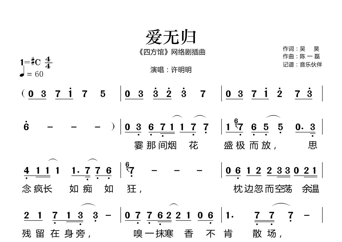 《爱无归》是许明明演唱的一首歌曲,这份简谱共有两张高清图谱,图谱由 @音乐伙伴 编配上传《四方馆》网络剧插曲。