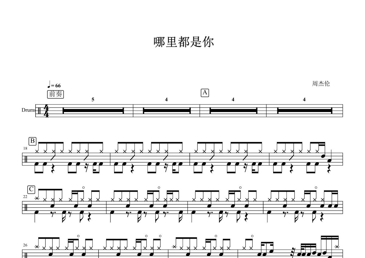 《哪里都是你》是周杰伦演唱的一首歌曲,这份鼓谱共有两张高清图谱,图谱由 @打鼓谱 编配上传,图谱使用五线谱编配,使用这份哪里都是你架子鼓谱,你将能够轻松地敲打出这首周杰伦的哪里都是你,快来尝试吧。《哪里都是你》是周杰伦演唱的一首歌曲,由周杰伦作曲、作词,黄雨勋编曲,收录在周杰伦2012年12月28日发行的专辑《12新作》中 [1] ,这首歌曲也是周杰伦执导的电影《天台》的主题曲。2014年这首歌曲获得了HitFm年度百首单曲奖。周杰伦(Jay Chou),1979年1月18日出生于台湾省新北市,祖籍福建省泉州市永春县,中国台湾流行乐男歌手、原创音乐人、演员、导演、编剧,毕业于淡江中学。