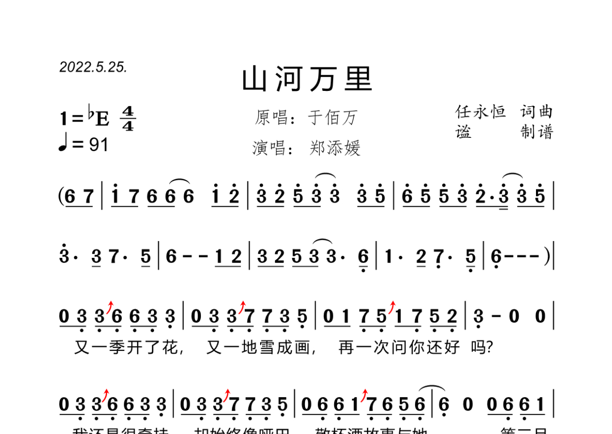 《山河万里》是郑添媛演唱的一首歌曲,拍号为4/4拍,歌曲速度为每分钟91拍,这份简谱共有两张高清图谱,图谱由 @谧 编配上传郑添媛演唱的《山河万里》,原版完整简谱,bE调,4/4拍,速度91,谧精心制谱,共2页。
