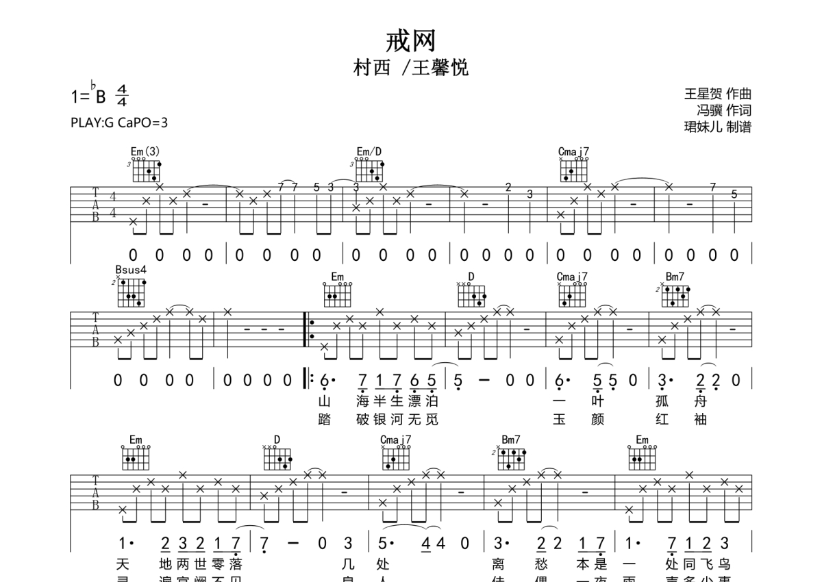 村西 /王馨悦《戒网》吉他谱 - G调弹唱六线谱
