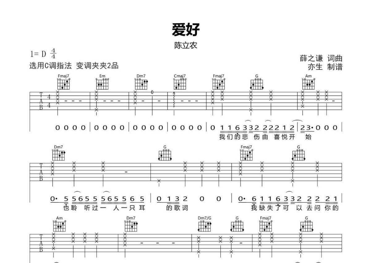 《爱好》是陈立农演唱的一首歌曲,拍号为4/4拍,歌曲原调为D调,但由于原调指法比较难,为了方便弹奏,本吉他谱采用的是C调指法编配,变调夹2品弹奏即为原调,当然也可以根据自己的音域改变变调夹位置,或者通过改变和弦调性,以方便自己弹奏,这份吉他谱共有两张高清图谱,图谱由 @亦生 编配上传,图谱使用六线谱编配,包含吉他和弦指法、简谱以及歌词部分,使用这份爱好吉他谱,可以让你更加方便地掌握这首歌曲的弹唱技巧,快来尝试吧。