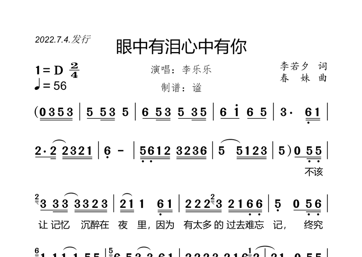 《眼中有泪心中有你》是李乐乐演唱的一首歌曲,拍号为4/4拍,歌曲速度为每分钟56拍,这份简谱共有两张高清图谱,图谱由 @谧 编配上传李乐乐演唱的《眼中有泪心中有你》,2022.7.4.发行,D调,2/4拍,速度56,原版完整简谱,谧精心制谱,共2页。