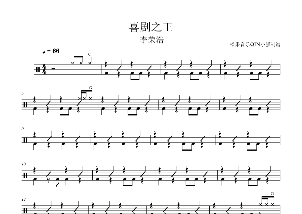 《喜剧之王》是李荣浩演唱的一首歌曲,拍号为4/4拍,这份架子鼓谱共有两张高清图谱,图谱由 @松果音乐QIN小强 编配上传,图谱使用五线谱编配,使用这份喜剧之王架子鼓谱,你将能够轻松地敲打出这首李荣浩的喜剧之王,快来尝试吧。《喜剧之王》是李荣浩演唱的一首歌曲,由黄伟文填词、李荣浩谱曲、编曲,收录在李荣浩2014年11月28日发行的专辑《李荣浩》中,是该专辑的第一主打歌。