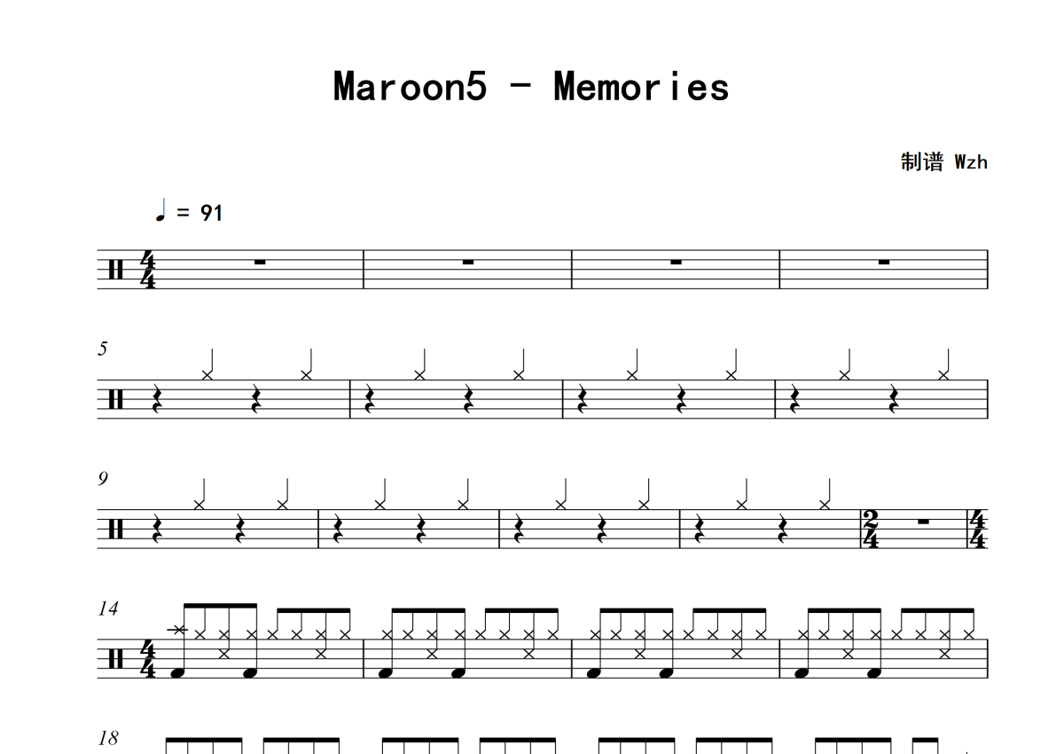 《Memories》是Maroon5演唱的一首歌曲,拍号为4/4拍,歌曲速度为每分钟91拍,这份架子鼓谱共有两张高清图谱,图谱由 @Sawubona 编配上传,图谱使用五线谱编配,使用这份Memories架子鼓谱,你将能够轻松地敲打出这首Maroon5的Memories,快来尝试吧。
