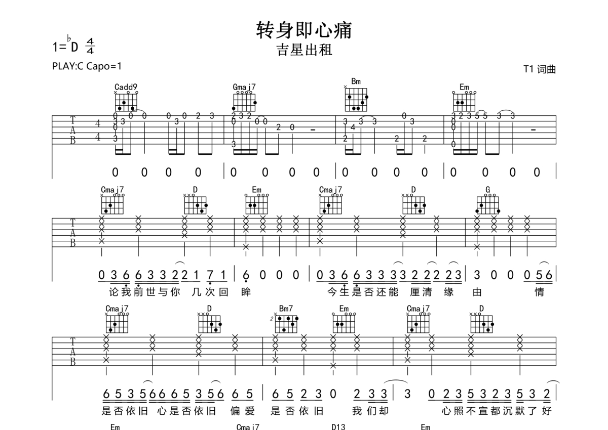 吉星出租《转身即心痛》吉他谱 - C调弹唱六线谱