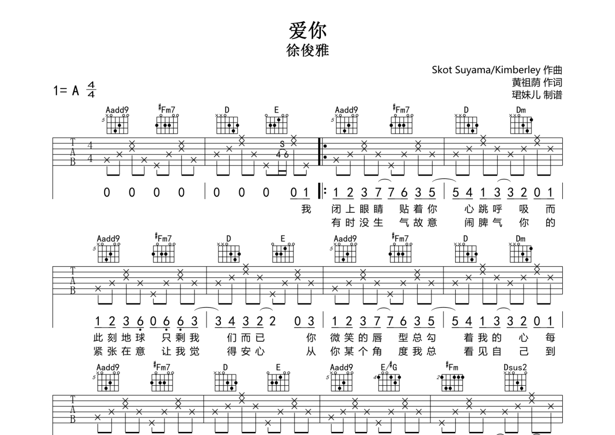 爱你吉他谱 - 徐俊雅 - A调弹唱六线谱