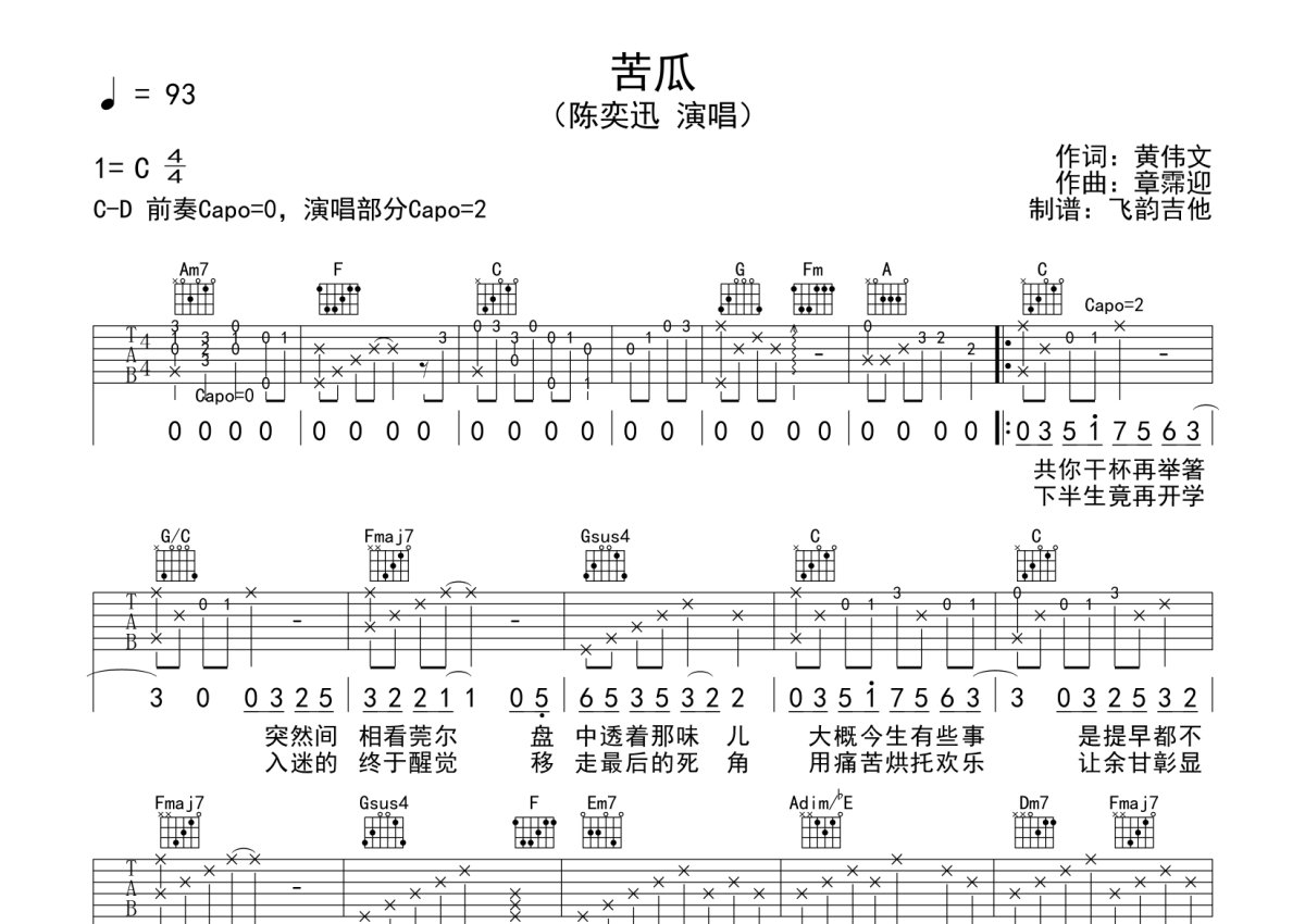 《苦瓜》是陈奕迅演唱的一首歌曲,本吉他谱采用的是D调指法编配,这份吉他谱共有两张高清图谱,图谱由 @何奔洋 编配上传,图谱使用六线谱编配,包含吉他和弦指法、简谱以及歌词部分,使用这份苦瓜吉他谱,可以让你更加方便地掌握这首歌曲的弹唱技巧,快来尝试吧。陈奕迅《苦瓜》吉他谱_D调吉他弹唱谱。