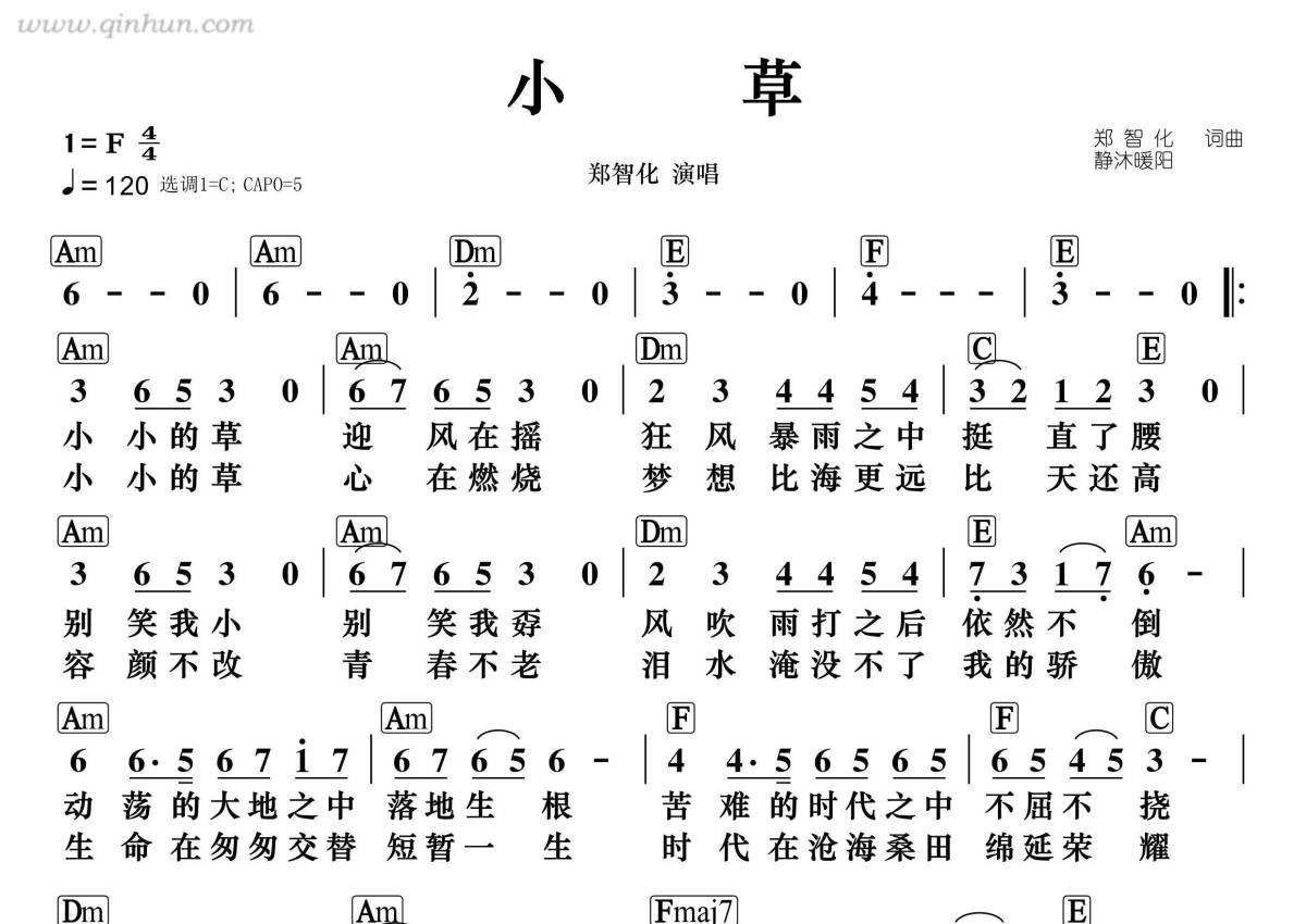 《小草》是郑智化演唱的一首歌曲,拍号为4/4拍,这份简谱共有一张高清图谱,图谱由 @静沐暖阳 编配上传。