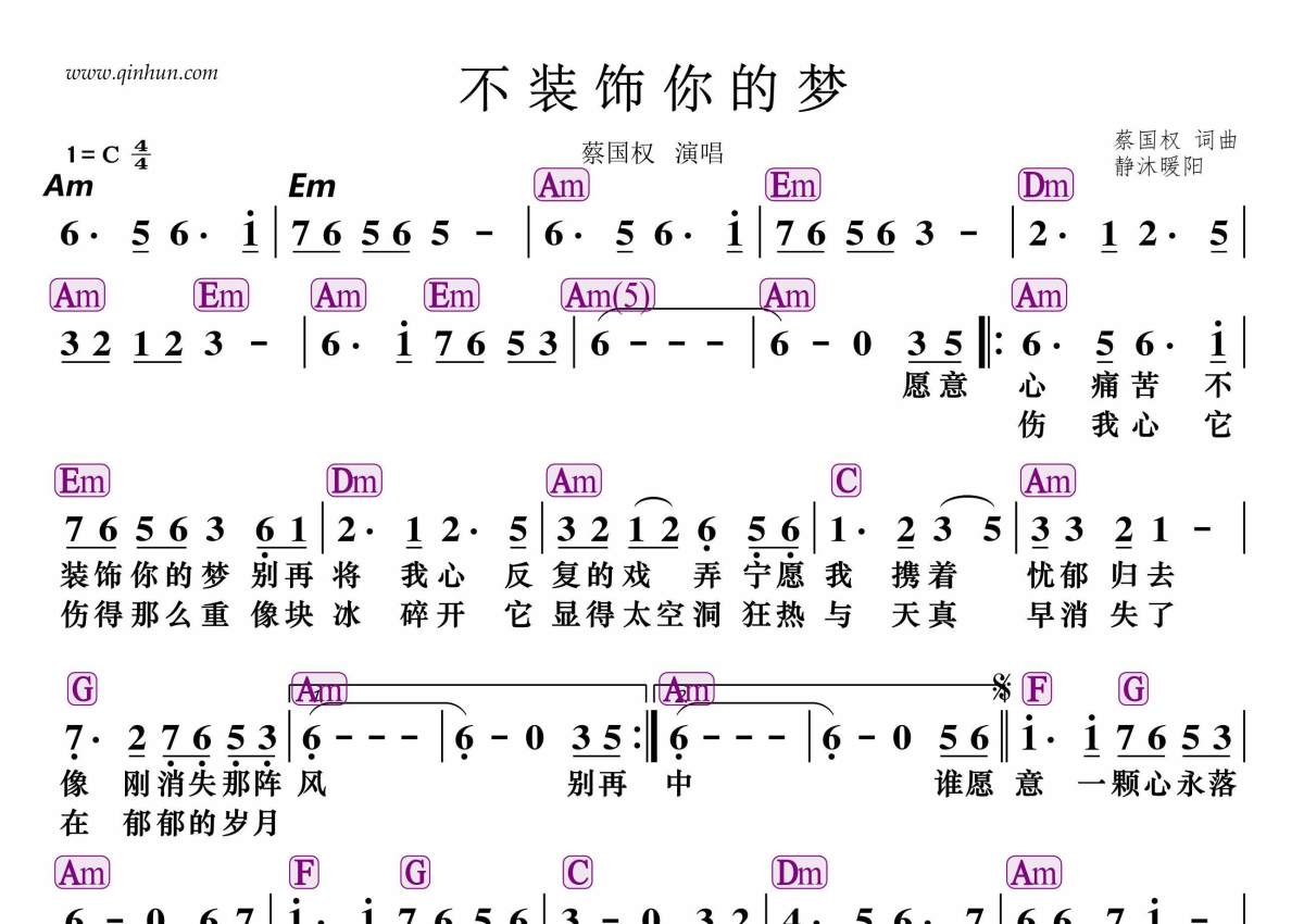 《不装饰你的梦》是蔡国权演唱的一首歌曲,拍号为4/4拍,这份简谱共有一张高清图谱,图谱由 @静沐暖阳 编配上传。
