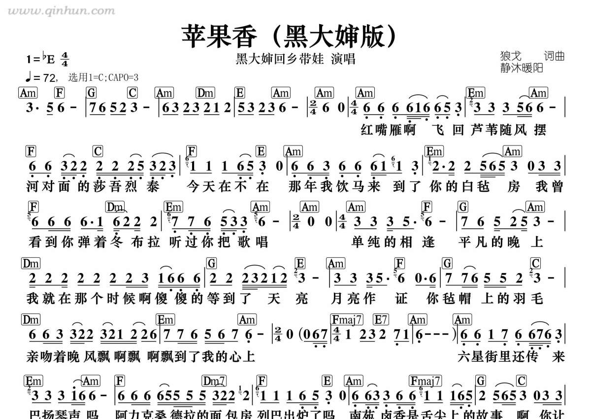 《苹果香(黑大婶版)》是黑大婶版演唱的一首歌曲,这份简谱共有一张高清图谱,图谱由 @静沐暖阳 编配上传。