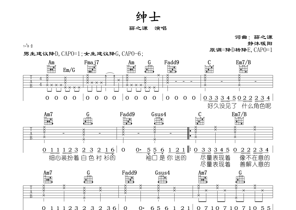 薛之谦《绅士》吉他谱 - D调弹唱六线谱