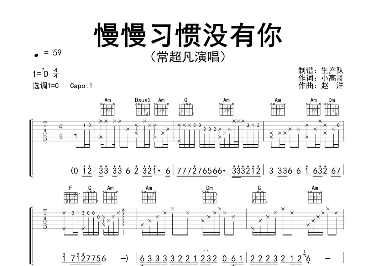 《慢慢习惯没有你》是常超凡演唱的一首歌曲,精编完美版,拍号为4/4拍,歌曲速度为每分钟59拍,歌曲原调为Db调,但由于原调指法比较难,为了方便弹奏,本吉他谱采用的是C调指法编配,变调夹1品弹奏即为原调,当然也可以根据自己的音域改变变调夹位置,或者通过改变和弦调性,以方便自己弹奏,这份吉他谱共有三张高清图谱,图谱由 @生产队 编配上传,图谱使用六线谱编配,包含吉他和弦指法、简谱以及歌词部分,使用这份慢慢习惯没有你吉他谱,可以让你更加方便地掌握这首歌曲的弹唱技巧,快来尝试吧。《慢慢习惯没有你》是常超凡演唱的歌曲。本吉他谱根据原版C调指法编配,完整的前奏、间奏、尾奏solo编配,精编完美版,一首好听的伤感情歌,值得推荐!就当是我上辈子欠了你,这辈子才会让我失去你,时间不会让我把你忘记,只会让我慢慢习惯没有你。