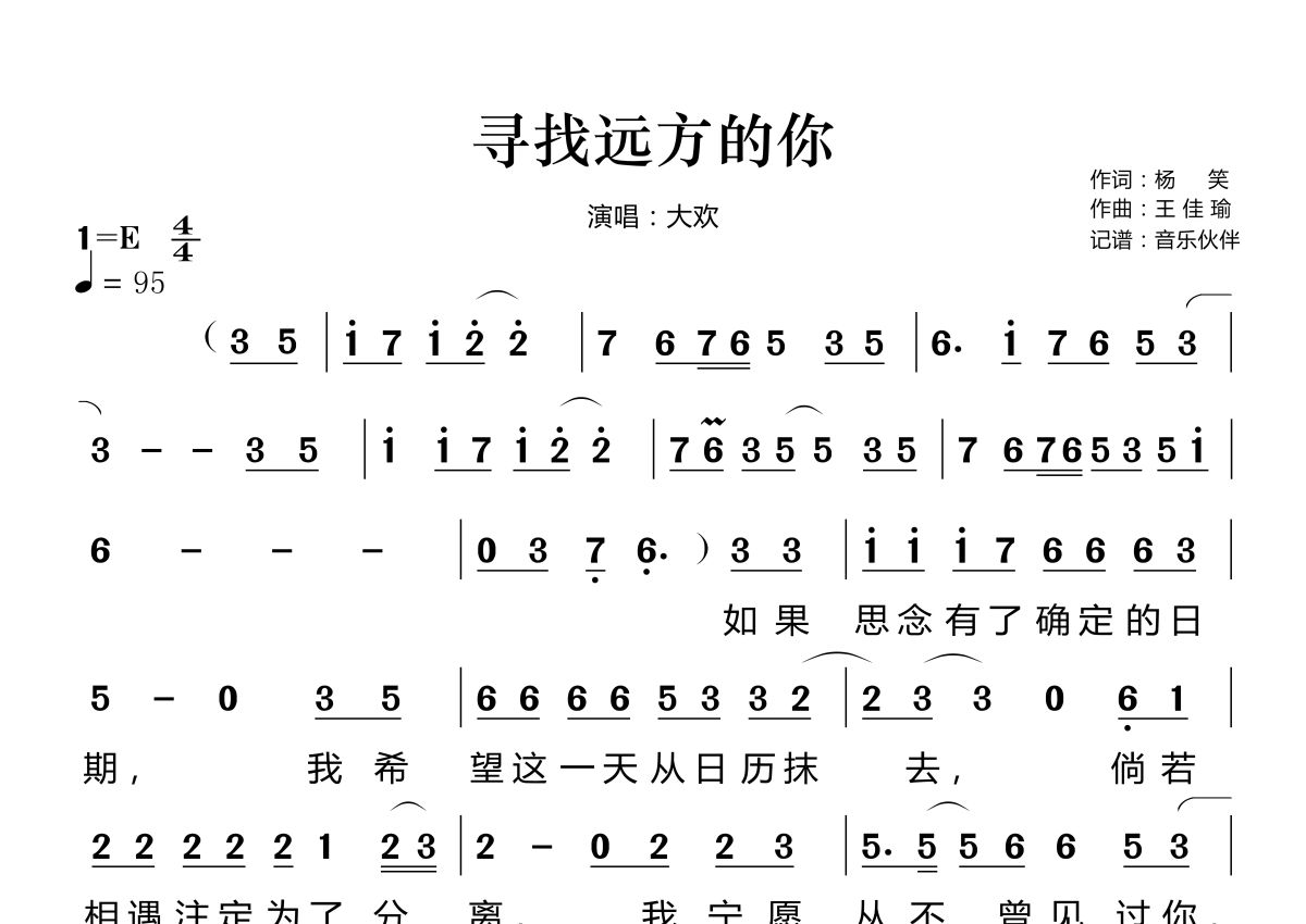 《寻找远方的你》是大欢演唱的一首歌曲,这份简谱共有两张高清图谱,图谱由 @音乐伙伴 编配上传。