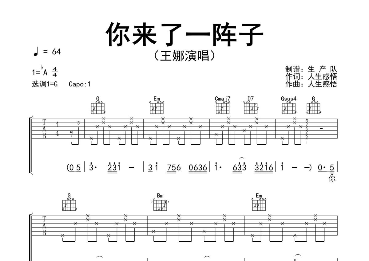 《你来了一阵子》是王娜演唱的一首歌曲,精编完美版,拍号为4/4拍,歌曲速度为每分钟64拍,歌曲原调为Ab调,但由于原调指法比较难,为了方便弹奏,本吉他谱采用的是G调指法编配,变调夹1品弹奏即为原调,当然也可以根据自己的音域改变变调夹位置,或者通过改变和弦调性,以方便自己弹奏,这份吉他谱共有三张高清图谱,图谱由 @生产队 编配上传,图谱使用六线谱编配,包含吉他和弦指法、简谱以及歌词部分,使用这份你来了一阵子吉他谱,可以让你更加方便地掌握这首歌曲的弹唱技巧,快来尝试吧。《你来了一阵子》是由歌手王娜演唱的歌曲。本吉他谱根据原版G调指法编配,完整的前奏、间奏、尾奏solo编配,精编完美版,一首好听的流行歌曲,值得推荐!你来了一阵子,我疼了一辈子,想你也找不到合适的方式,想要放弃你却又害怕失去你,因为我的世界你无人能代替。