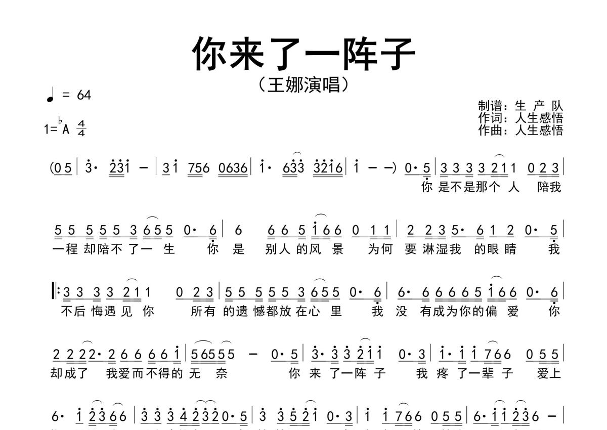 《你来了一阵子》是王娜演唱的一首歌曲,原版简谱,拍号为4/4拍,歌曲速度为每分钟64拍,这份简谱共有一张高清图谱,图谱由 @生产队 编配上传王娜演唱的歌曲《你来了一阵子》原版简谱,完整的前奏、间奏、尾奏solo编配。