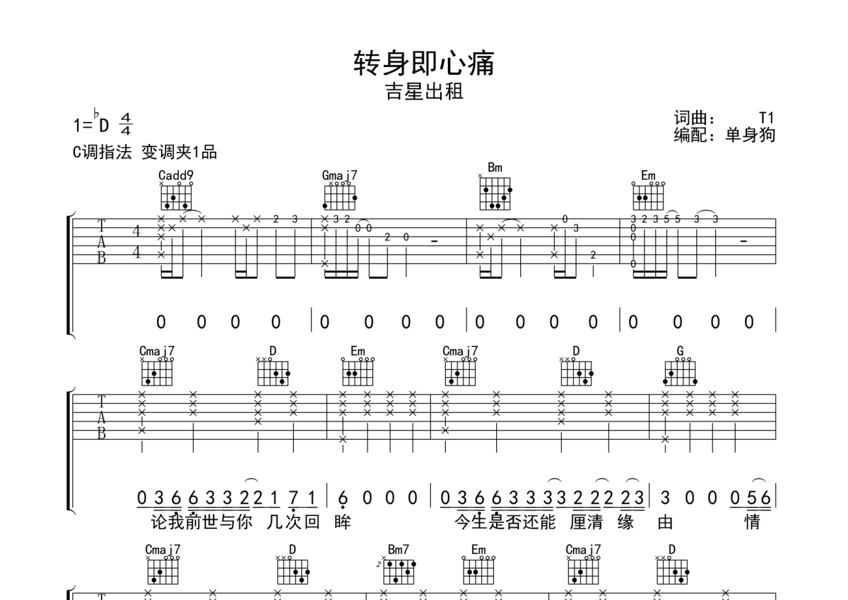 《转身即心痛》是吉星出租演唱的一首歌曲,拍号为4/4拍,歌曲原调为Db调,但由于原调指法比较难,为了方便弹奏,本吉他谱采用的是C调指法编配,变调夹1品弹奏即为原调,当然也可以根据自己的音域改变变调夹位置,或者通过改变和弦调性,以方便自己弹奏,这份吉他谱共有两张高清图谱,图谱由 @单身狗 编配上传,图谱使用六线谱编配,包含吉他和弦指法、简谱以及歌词部分,使用这份转身即心痛吉他谱,可以让你更加方便地掌握这首歌曲的弹唱技巧,快来尝试吧。