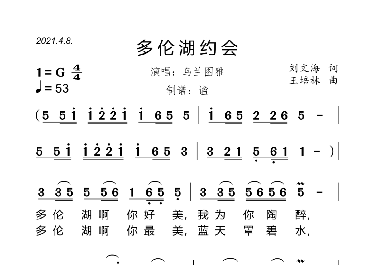 《多伦湖约会》是乌兰图雅演唱的一首歌曲,拍号为4/4拍,歌曲速度为每分钟53拍,这份简谱共有两张高清图谱,图谱由 @谧 编配上传乌兰图雅演唱的《多伦湖约会》,原唱原版完整简谱,2021.4.8.发行,G调,4/4拍,速度53,谧精心制谱,大字版,共2页。
