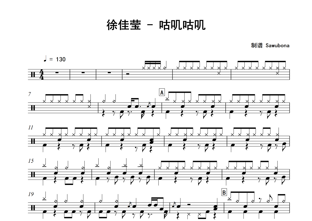《咕叽咕叽》是徐佳莹演唱的一首歌曲,拍号为4/4拍,歌曲速度为每分钟130拍,这份架子鼓谱共有三张高清图谱,图谱由 @Sawubona 编配上传,图谱使用五线谱编配,使用这份咕叽咕叽架子鼓谱,你将能够轻松地敲打出这首徐佳莹的咕叽咕叽,快来尝试吧。